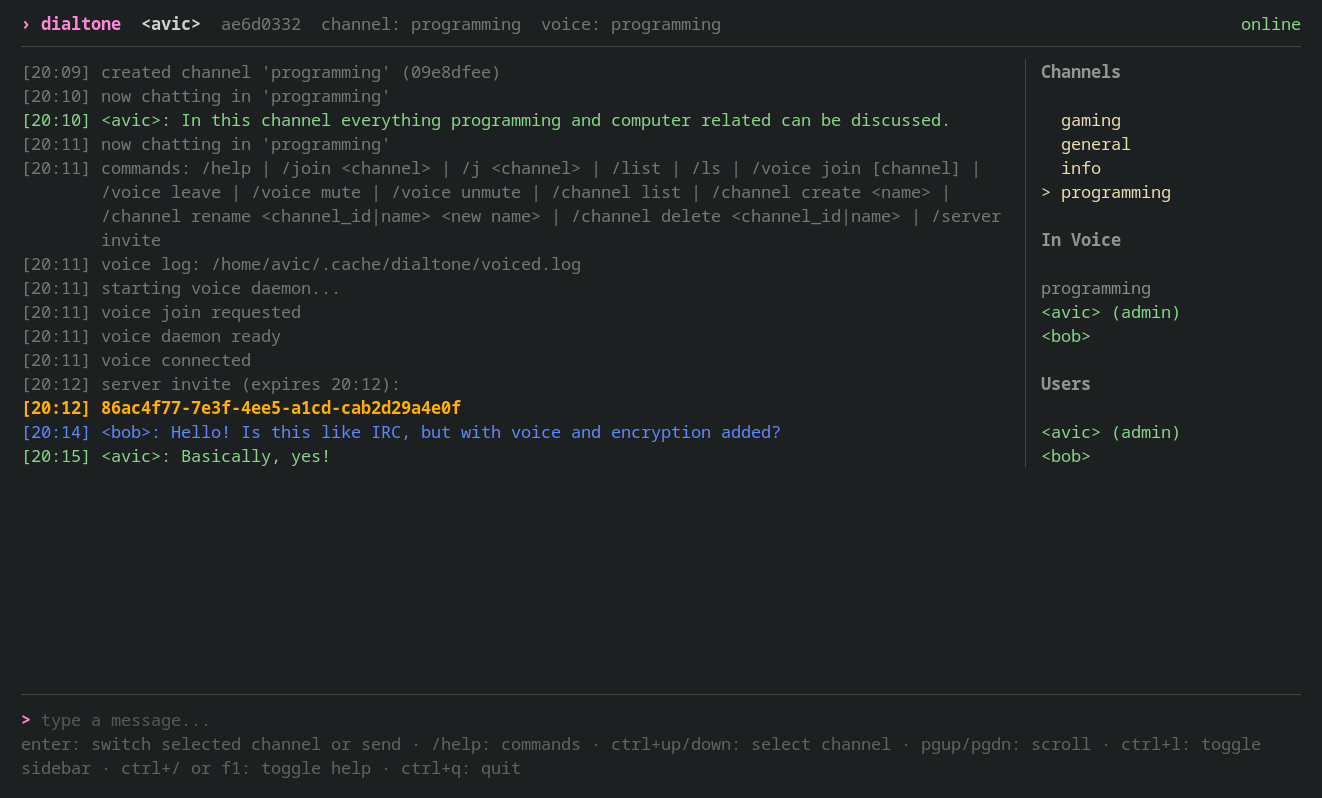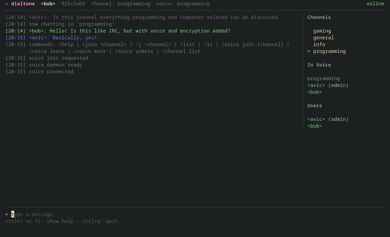 Dialtone is a realtime chat project written in Go, built around a WebSocket server, a terminal client, and a separate voice daemon. The main goal is straightforward: keep everyday chat fast while reducing server visibility into message content. In practice, channel message bodies, sender display names, and channel names are encrypted client-side before upload, while the server stores and routes ciphertext plus the metadata required for delivery and authorization.