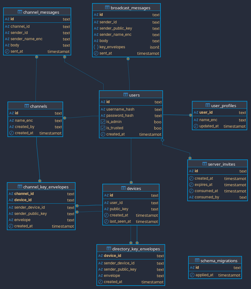 The practical boundary is: content fields are client-encrypted, while operational metadata remains visible to the server (for example user IDs, channel IDs, timestamps, device public keys, and envelope routing fields). The current model assumes clients trust server-delivered device public keys (no out-of-band fingerprint verification layer yet).