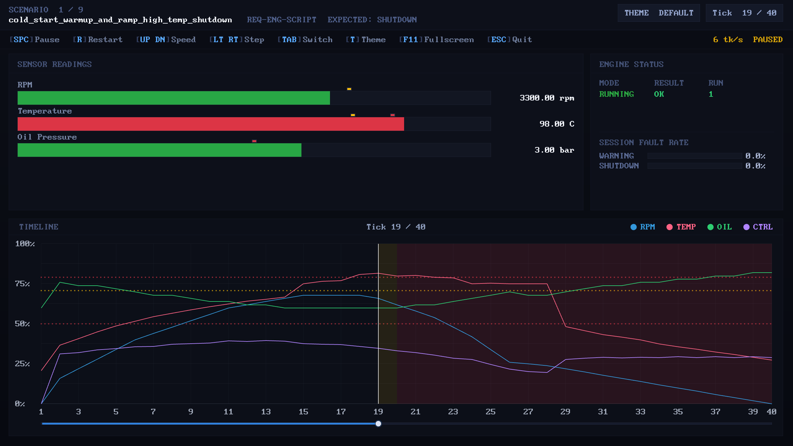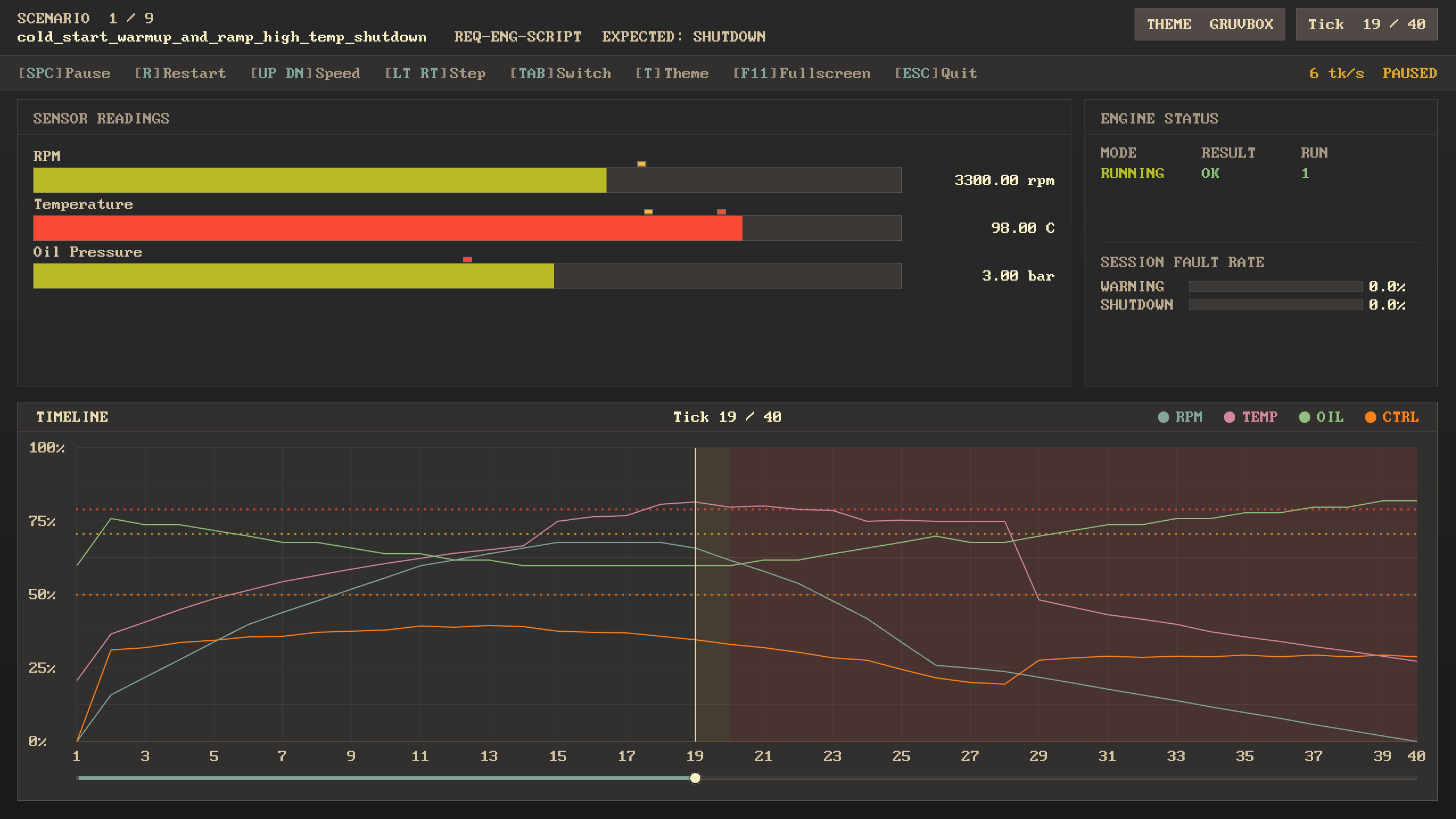 It is a separate Raylib program that reads the JSON output file and plays it back as an animated dashboard. It shows RPM, temperature, and oil pressure as real-time line graphs with threshold overlays drawn at the calibrated limits. The current engine mode (INIT, STARTING, RUNNING, WARNING, SHUTDOWN) is displayed alongside the graphs so you can see exactly which tick caused a state transition. A scrubbable tick slider lets you step forward and backward through the scenario. You can switch between multiple scenarios and see cumulative pass/fail statistics.