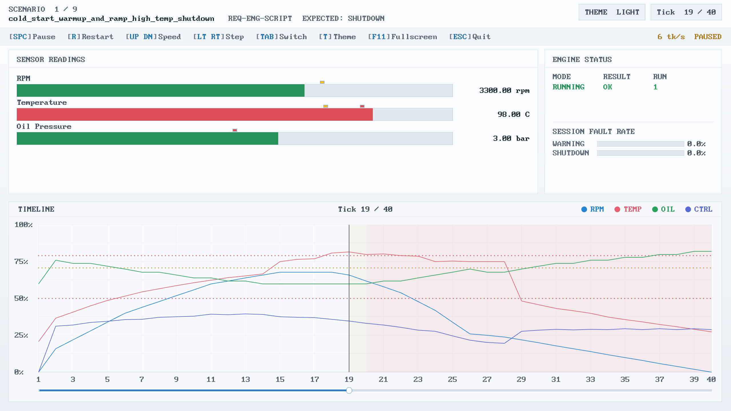 The simulator itself is a command-line tool that outputs JSON. That is great for CI pipelines and automated gating, but not very helpful when you want to understand why a scenario triggered a shutdown at tick 14 or see how oil pressure drifted over time. The visualizer exists to make that kind of analysis quick and intuitive.