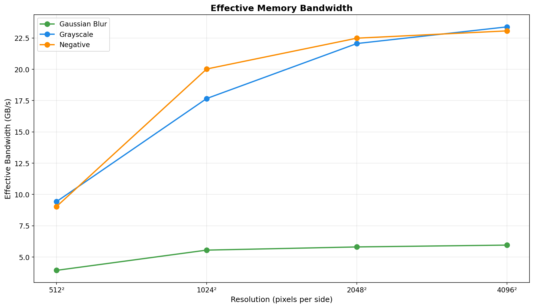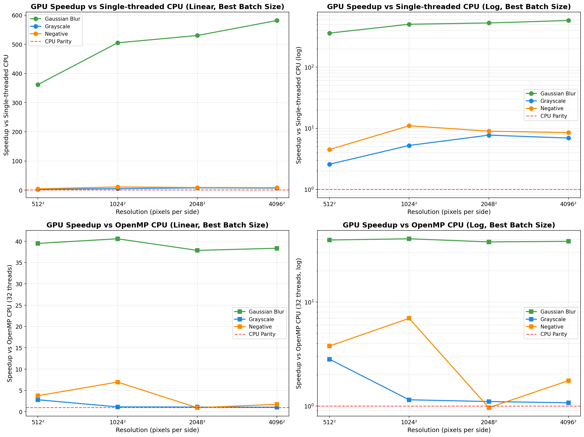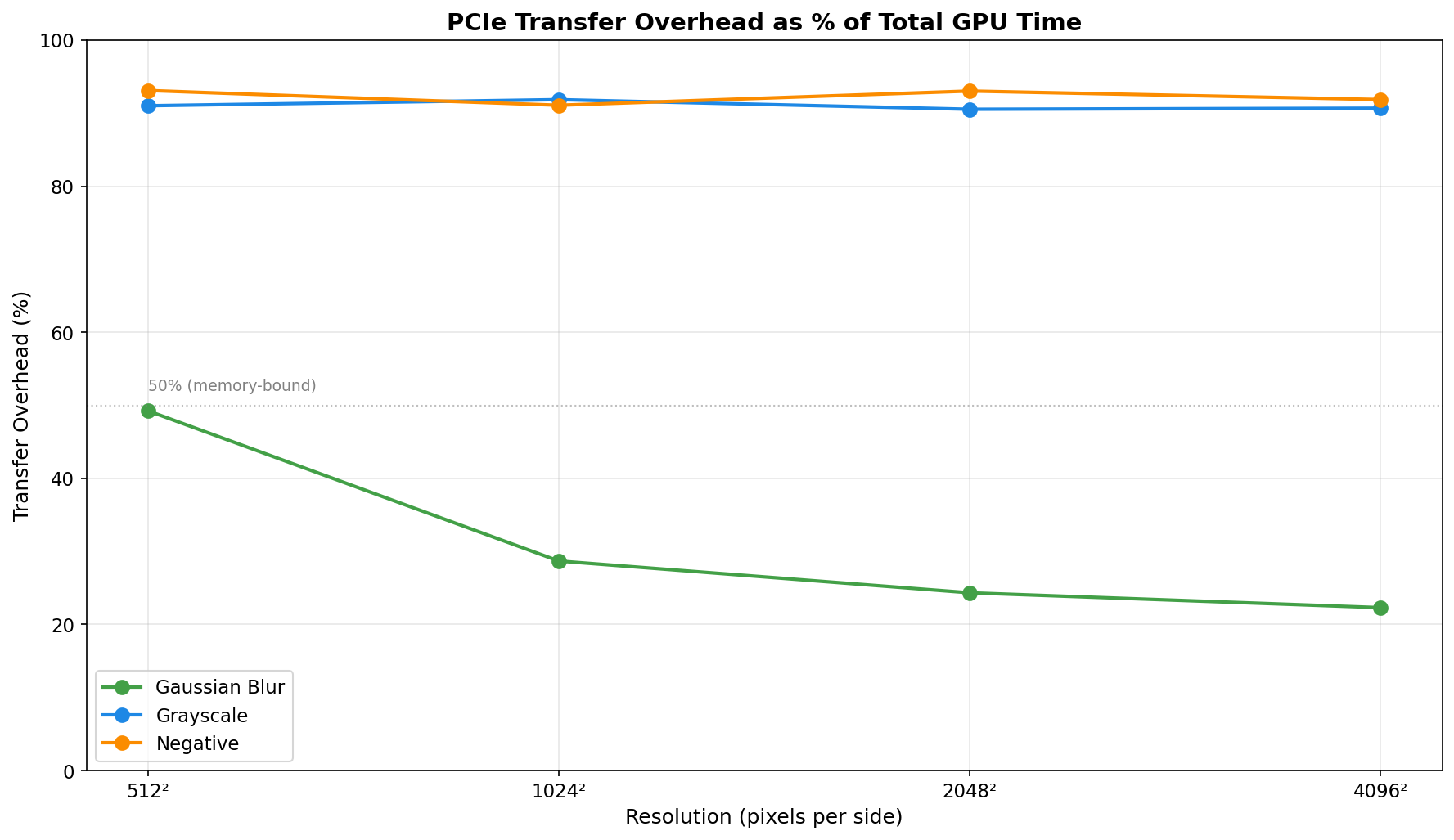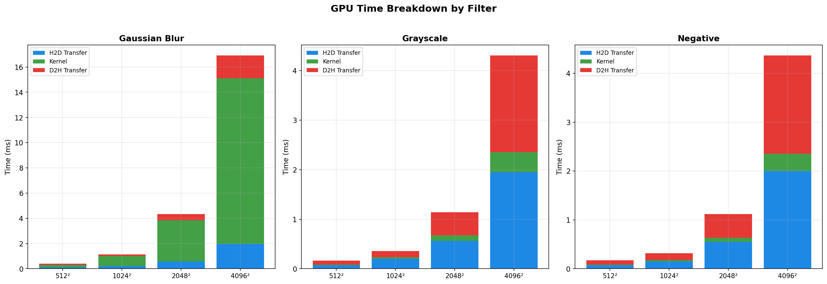 As resolution increases, kernel execution grows quadratically while transfer overhead (as percentage) decreases. This makes GPU acceleration increasingly attractive for larger images, particularly for compute-intensive operations. At 4096², even memory-bound filters show 6-9× speedup vs single-thread CPU, though they remain slower than OpenMP.